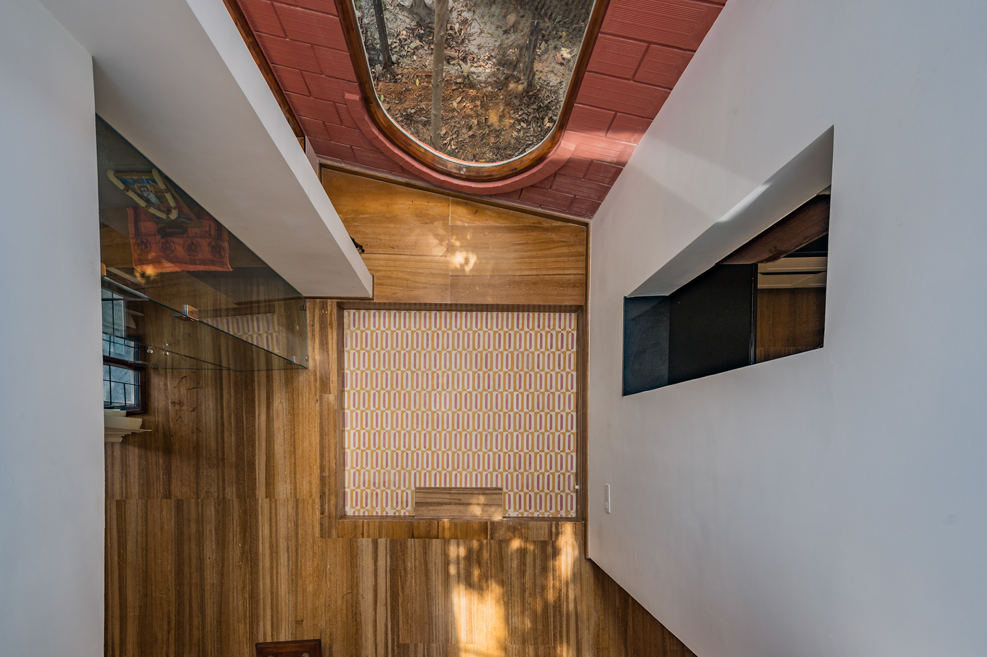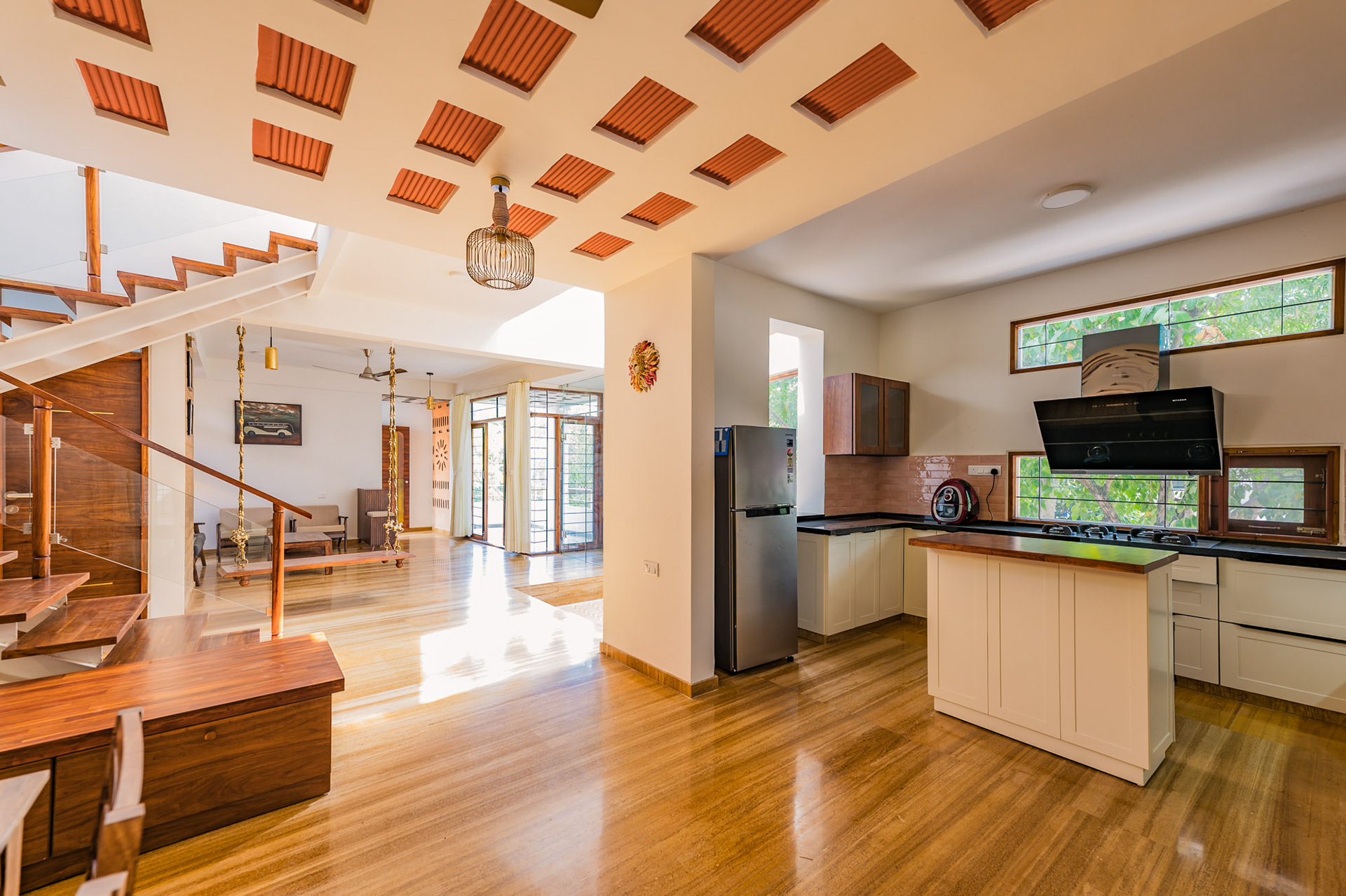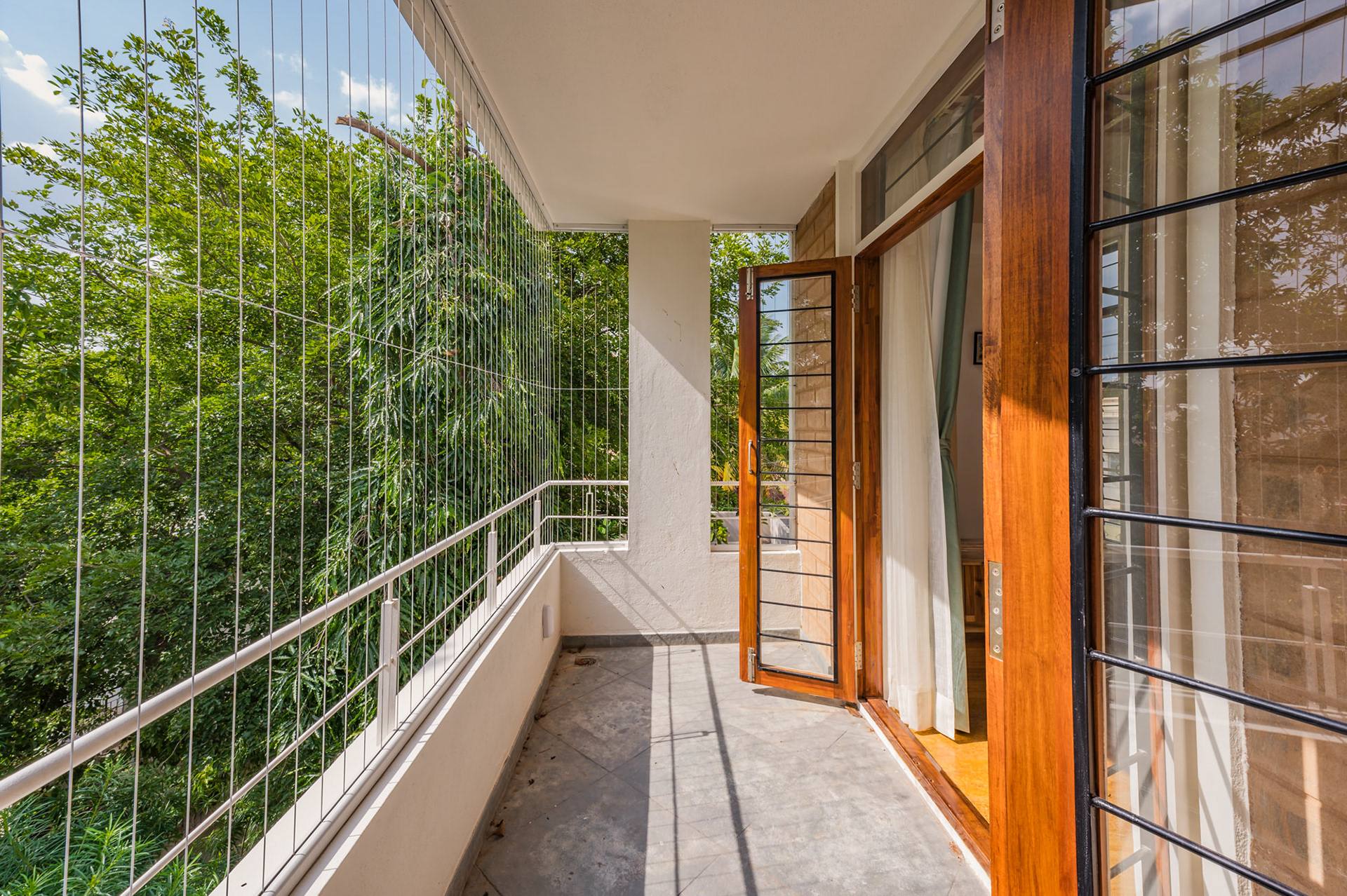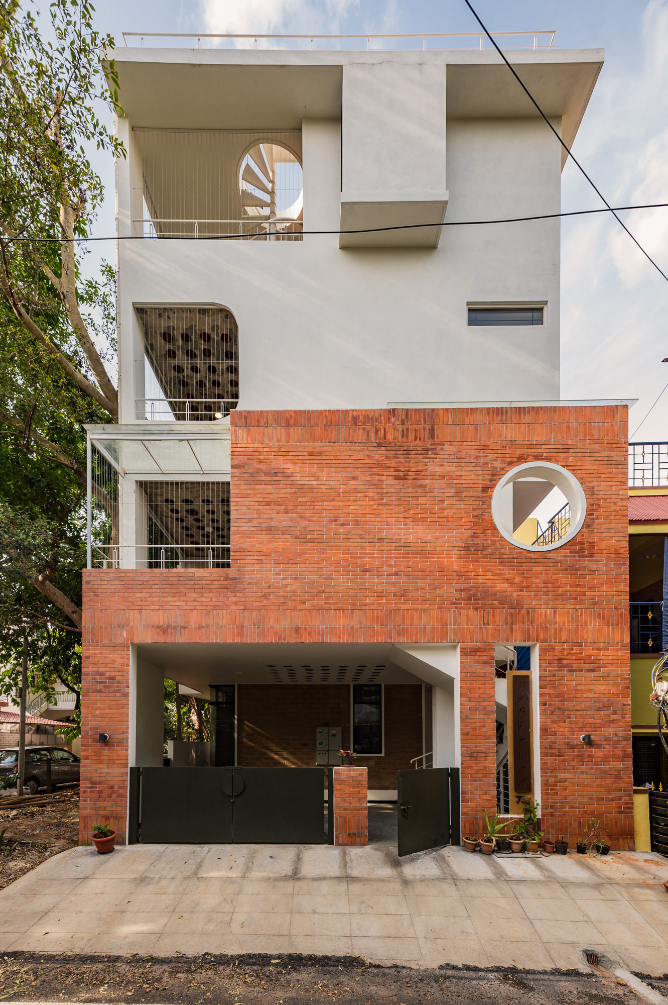 The home is designed to honour the trees flanking the site and to be a respite to come back to from Dubai for Santosh and Deepali.