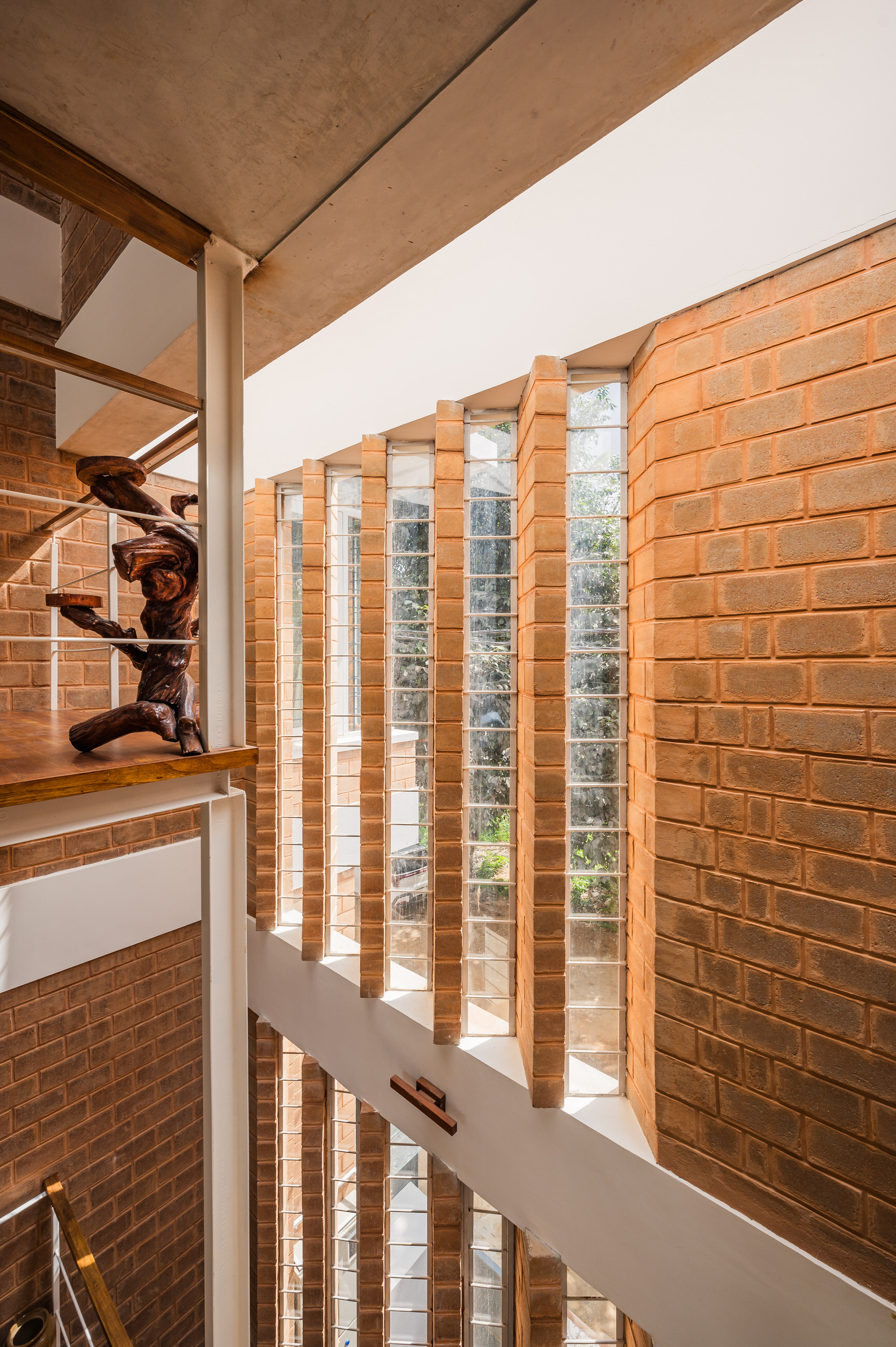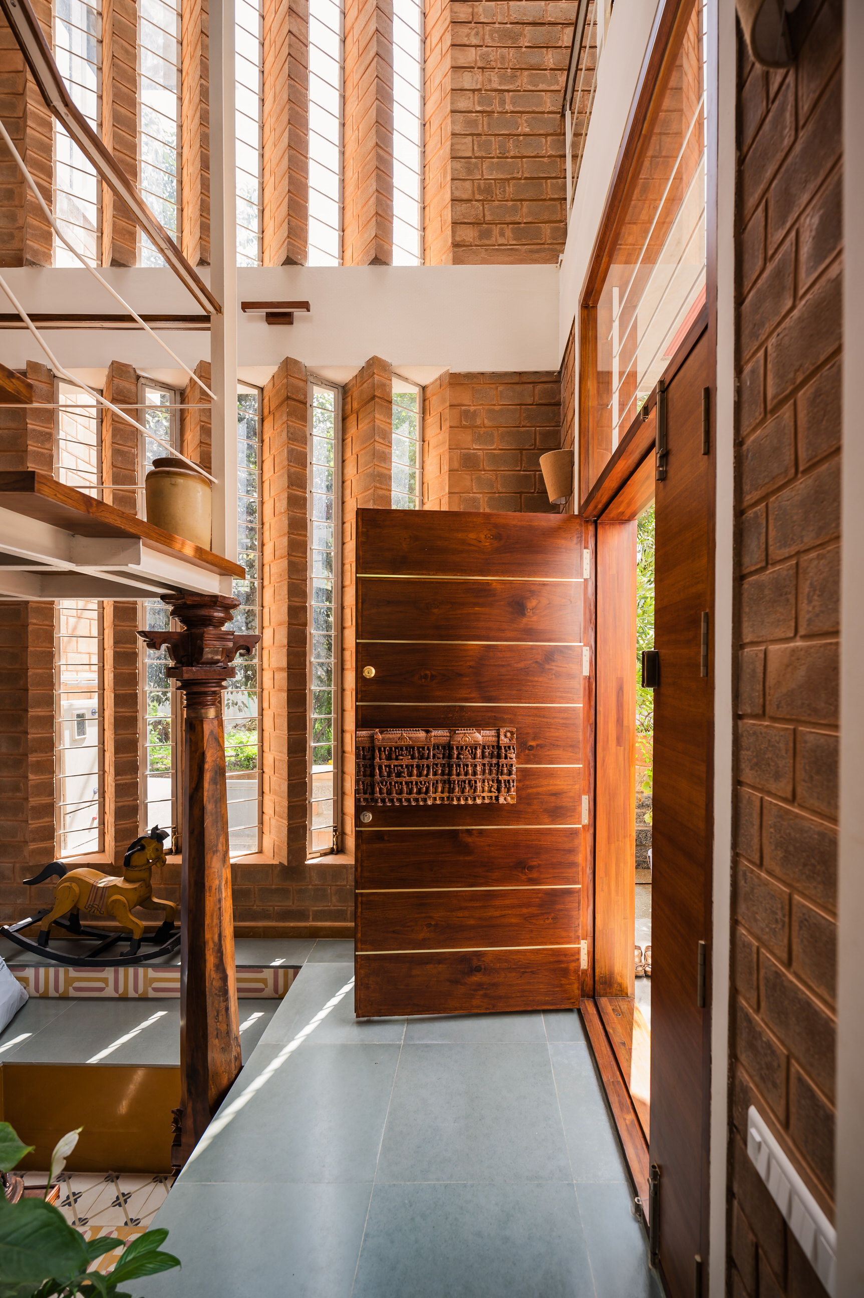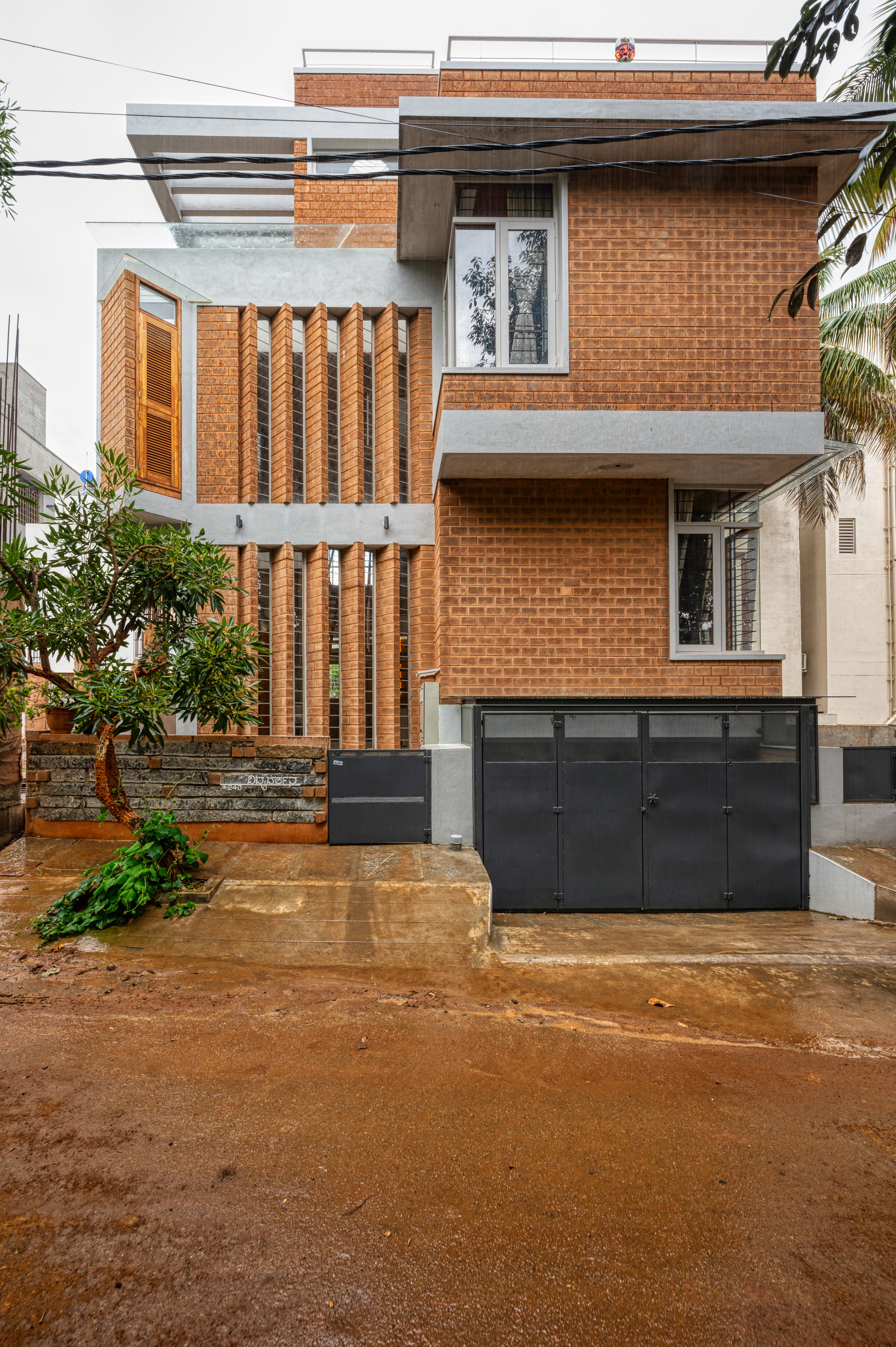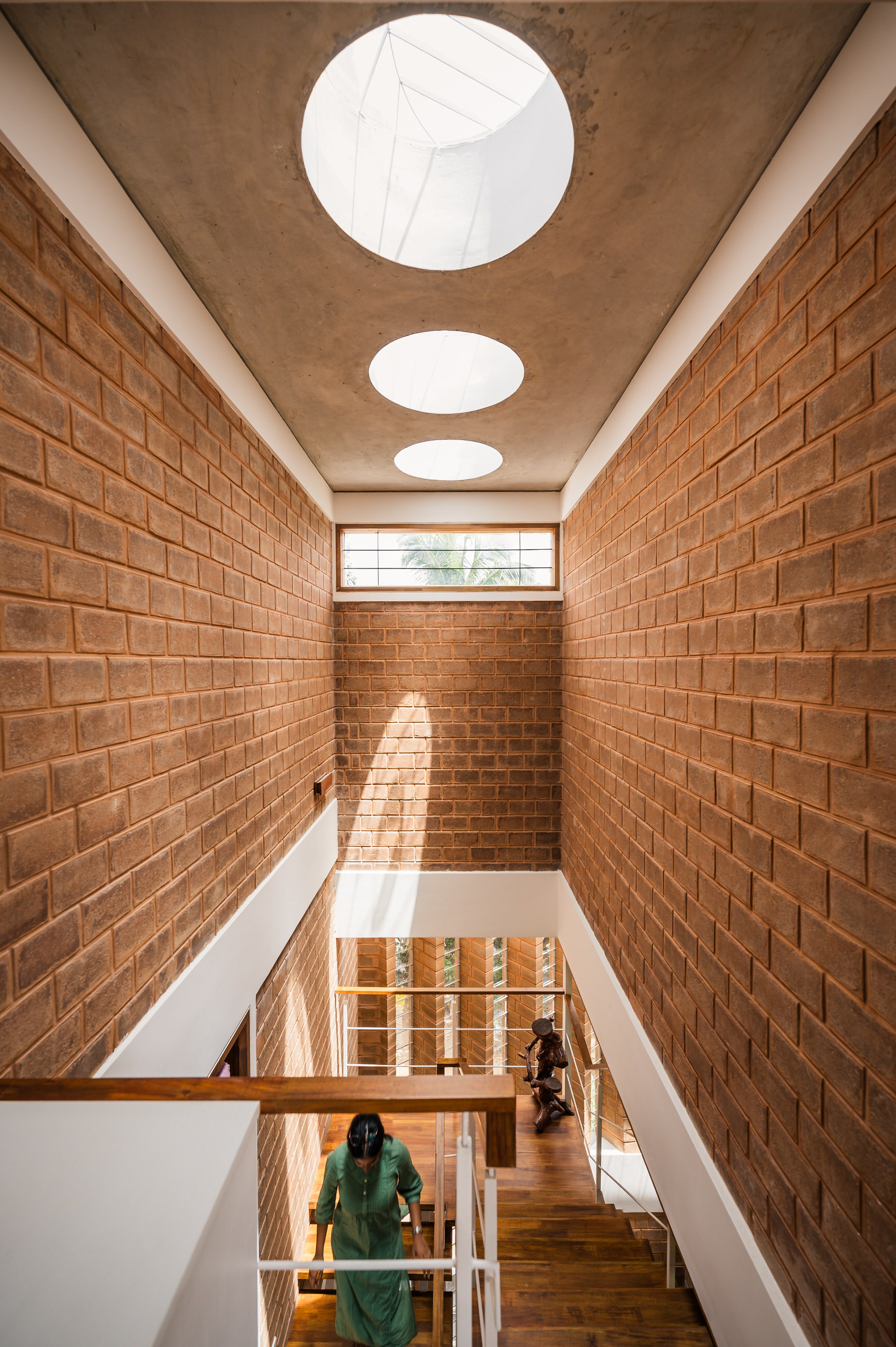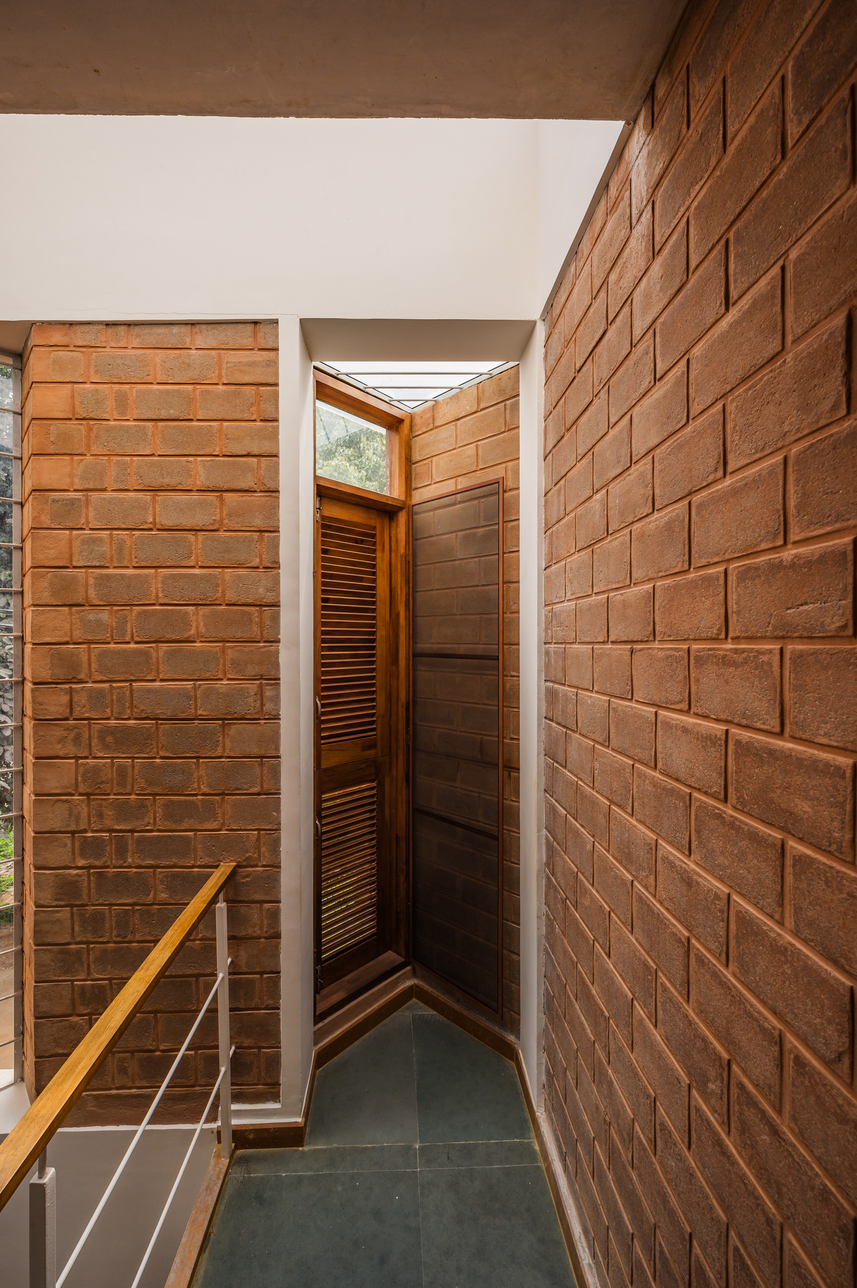 Divyadarshana — A Home Rooted in Material Warmth and Light (Designed and Executed by Studio Alaya | Photography & Project narrative by Ravi Teja Devarakonda) Nestled in the quiet lanes of Bengaluru’s Telecom Layout, Divyadarshana Residence was designed as a warm, functional, and light-filled home for Divya, a homemaker, and Darshan, a software engineer, along with their young daughter. The family envisioned a space that feels open and connected, yet private and calm — a home that resonates with simplicity and honesty. The design approach stemmed from this intent — to create a residence that breathes, where natural light, ventilation, and materiality work together to shape a tranquil everyday experience. The exposed brick façade, interspersed with vertical jaalis, establishes a rhythmic play of solids and voids while bringing filtered daylight into the interiors. The restrained use of concrete bands and wooden textures adds depth and balance to the overall composition. Inside, spaces unfold naturally — the living, dining, and kitchen areas flow into one another, extending toward a small sit-out that connects the indoors with the outdoors. At the heart of the home lies a vertical spine — a staircase crowned by a skylight that draws daylight deep into the house, tying all three levels together visually and spatially. Each material and proportion has been chosen for its integrity and timelessness, allowing the home to age gracefully while maintaining a quiet character. Divyadarshana embodies Studio Alaya’s belief that good architecture is not about excess but about balance — between function and feeling, openness and intimacy, light and form. Design Team: Ar. Lavannya Goradia, Aditi Salunke, Richa Kriplani, SB Namitha, Gitanjali, Karishma Execution Team: Deekshith RN, Praveen Cariappa, Shalini Bai, Rishab Kapoor