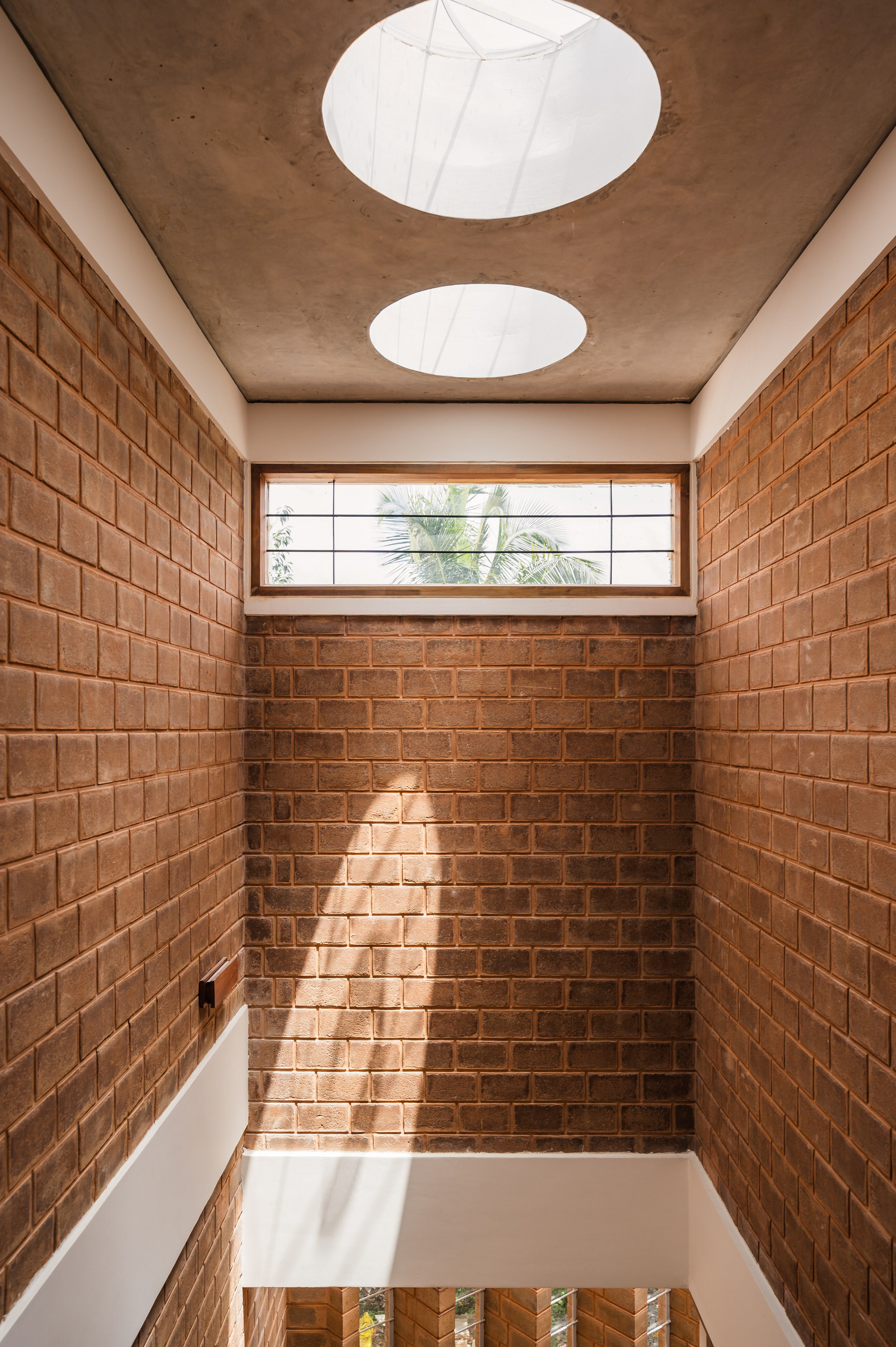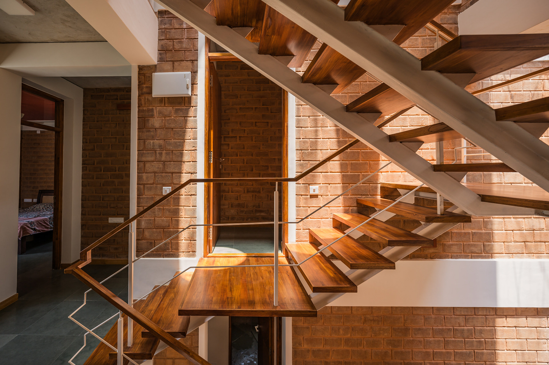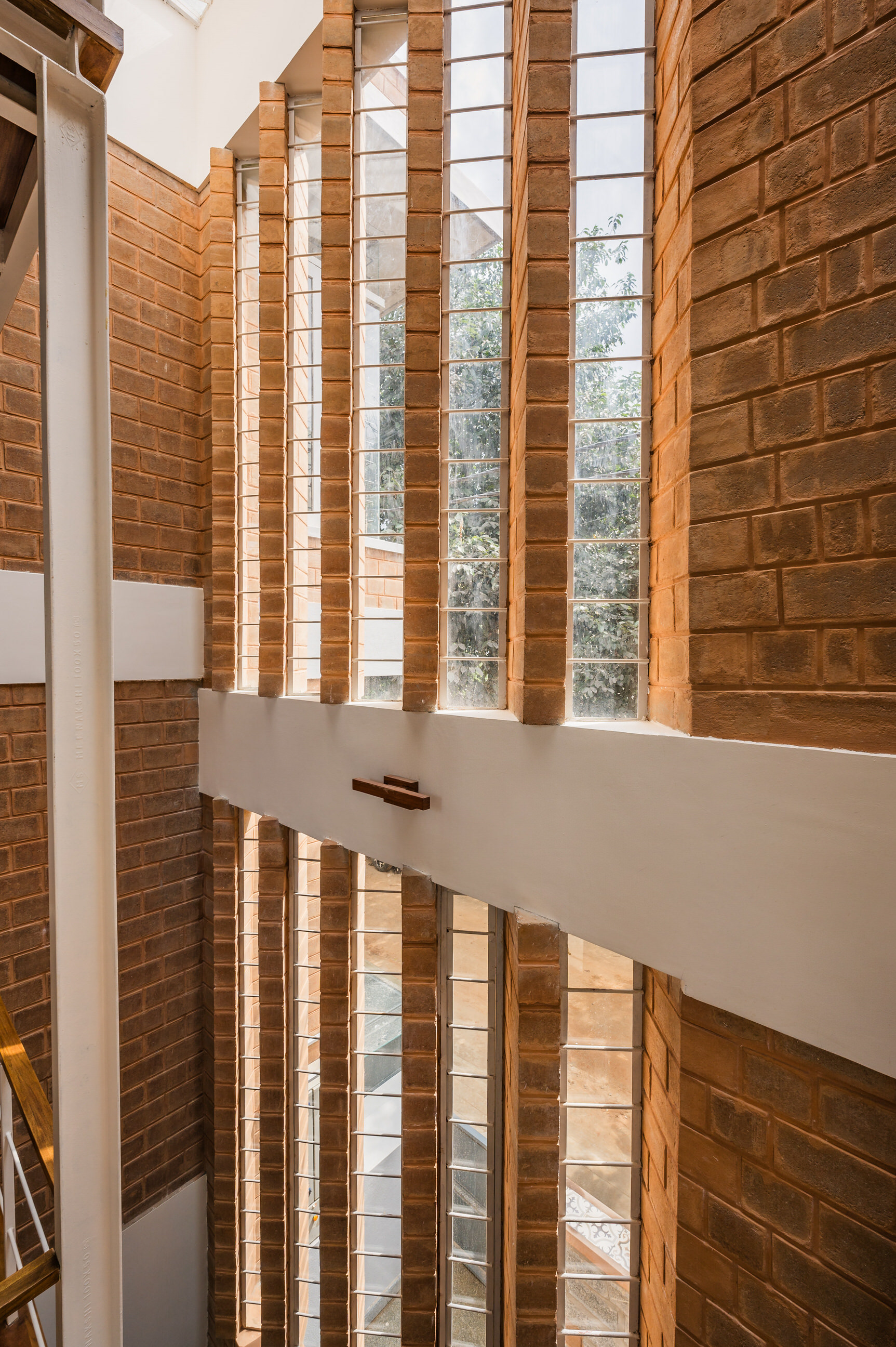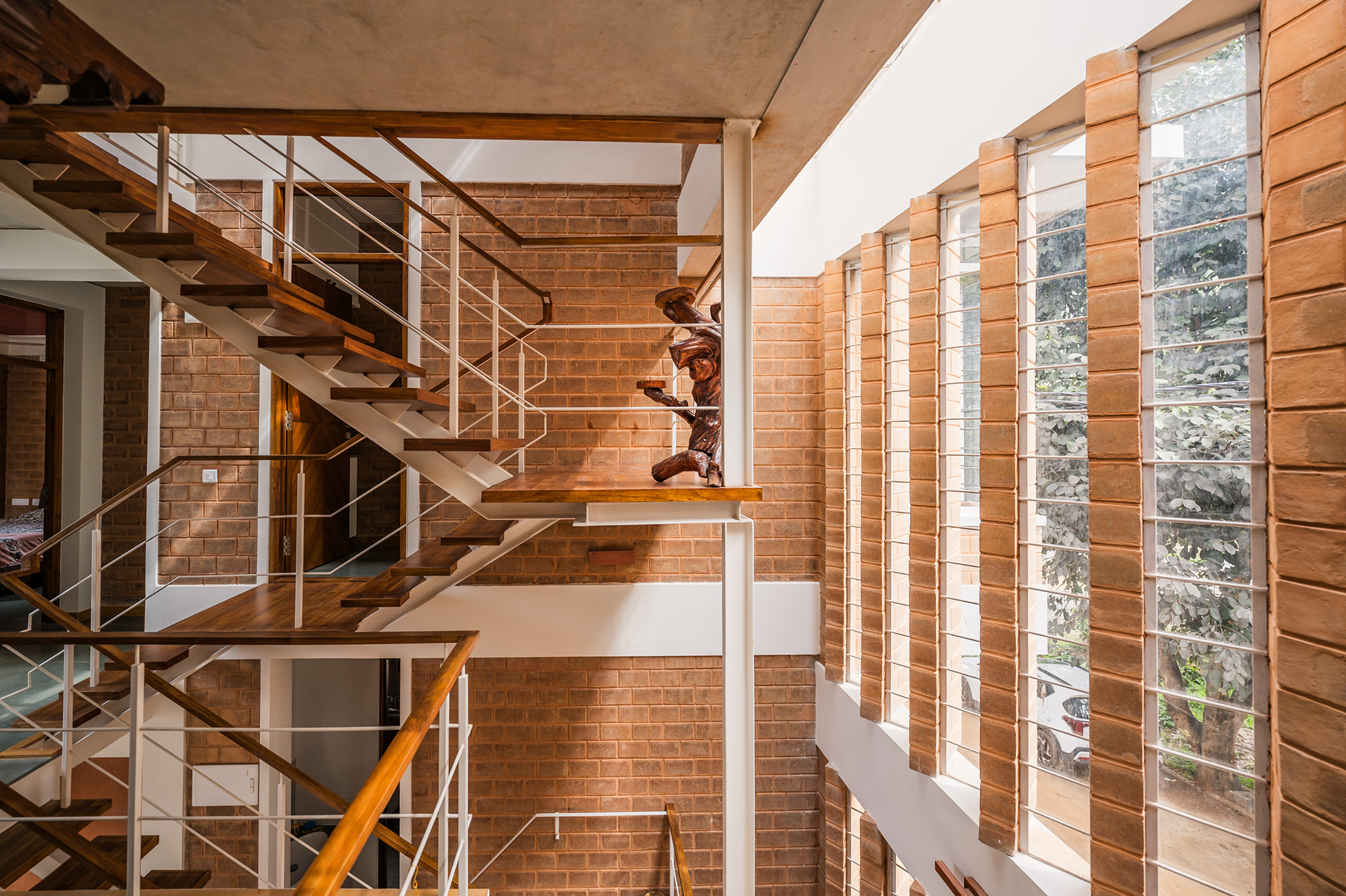 Divyadarshana — A Home Rooted in Material Warmth and Light (Designed and Executed by Studio Alaya | Photography & Project narrative by Ravi Teja Devarakonda) Nestled in the quiet lanes of Bengaluru’s Telecom Layout, Divyadarshana Residence was designed as a warm, functional, and light-filled home for Divya, a homemaker, and Darshan, a software engineer, along with their young daughter. The family envisioned a space that feels open and connected, yet private and calm — a home that resonates with simplicity and honesty. The design approach stemmed from this intent — to create a residence that breathes, where natural light, ventilation, and materiality work together to shape a tranquil everyday experience. The exposed brick façade, interspersed with vertical jaalis, establishes a rhythmic play of solids and voids while bringing filtered daylight into the interiors. The restrained use of concrete bands and wooden textures adds depth and balance to the overall composition. Inside, spaces unfold naturally — the living, dining, and kitchen areas flow into one another, extending toward a small sit-out that connects the indoors with the outdoors. At the heart of the home lies a vertical spine — a staircase crowned by a skylight that draws daylight deep into the house, tying all three levels together visually and spatially. Each material and proportion has been chosen for its integrity and timelessness, allowing the home to age gracefully while maintaining a quiet character. Divyadarshana embodies Studio Alaya’s belief that good architecture is not about excess but about balance — between function and feeling, openness and intimacy, light and form. Design Team: Ar. Lavannya Goradia, Aditi Salunke, Richa Kriplani, SB Namitha, Gitanjali, Karishma Execution Team: Deekshith RN, Praveen Cariappa, Shalini Bai, Rishab Kapoor