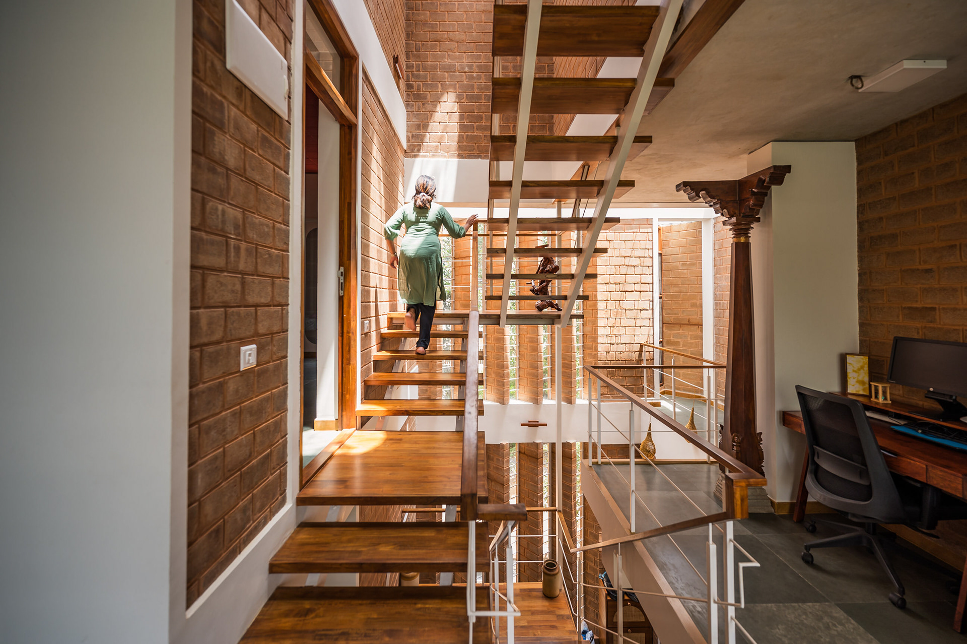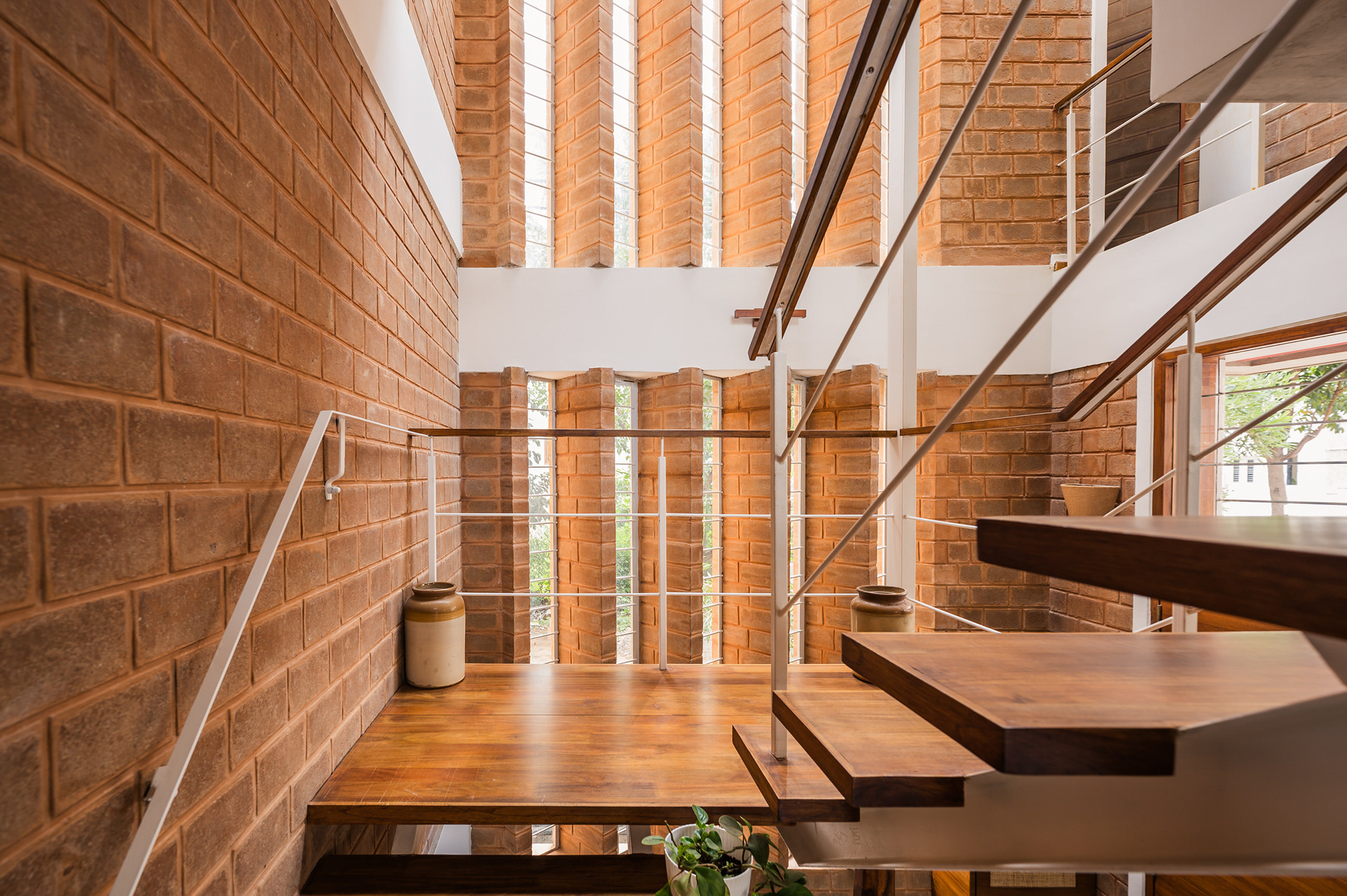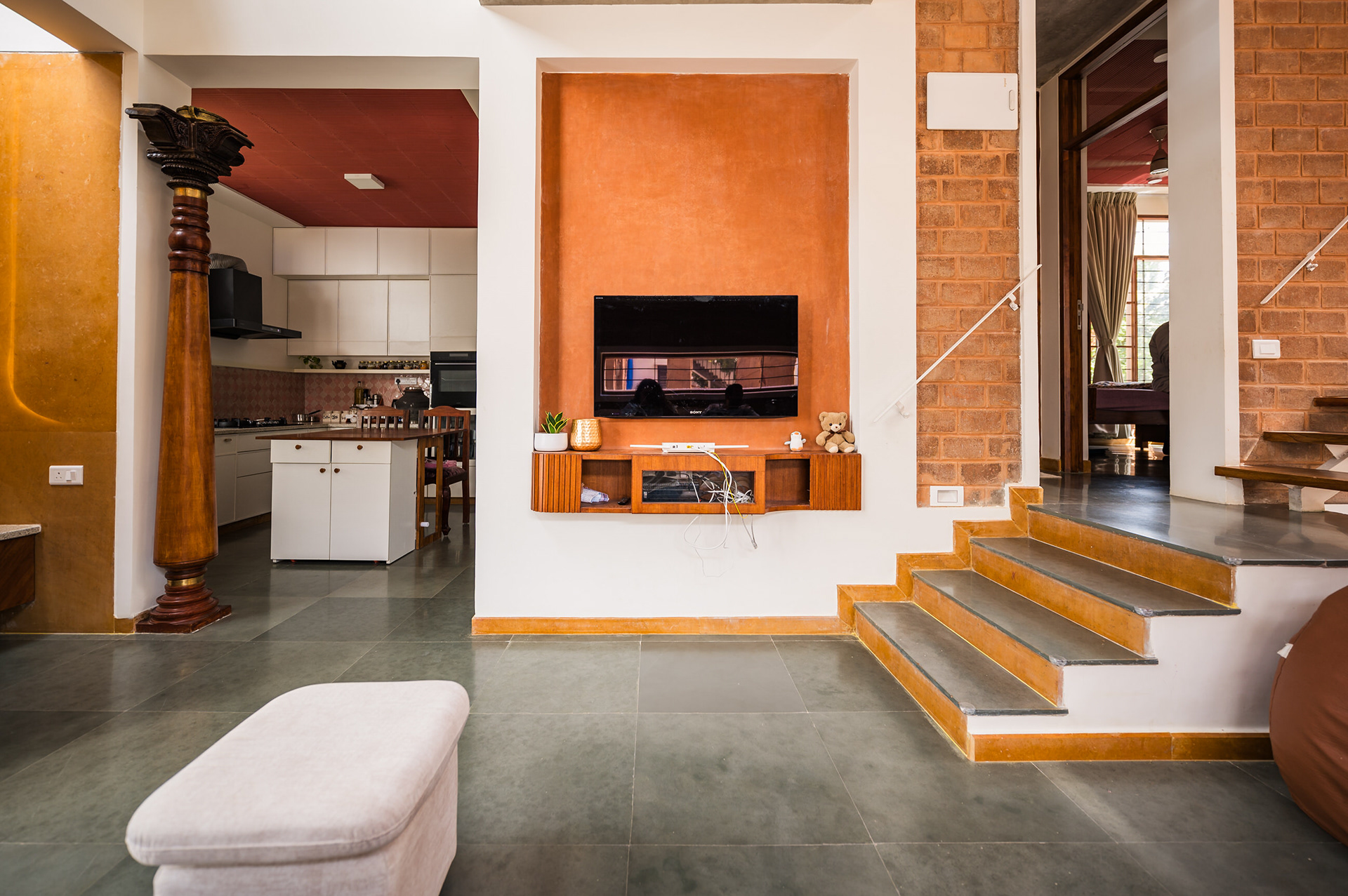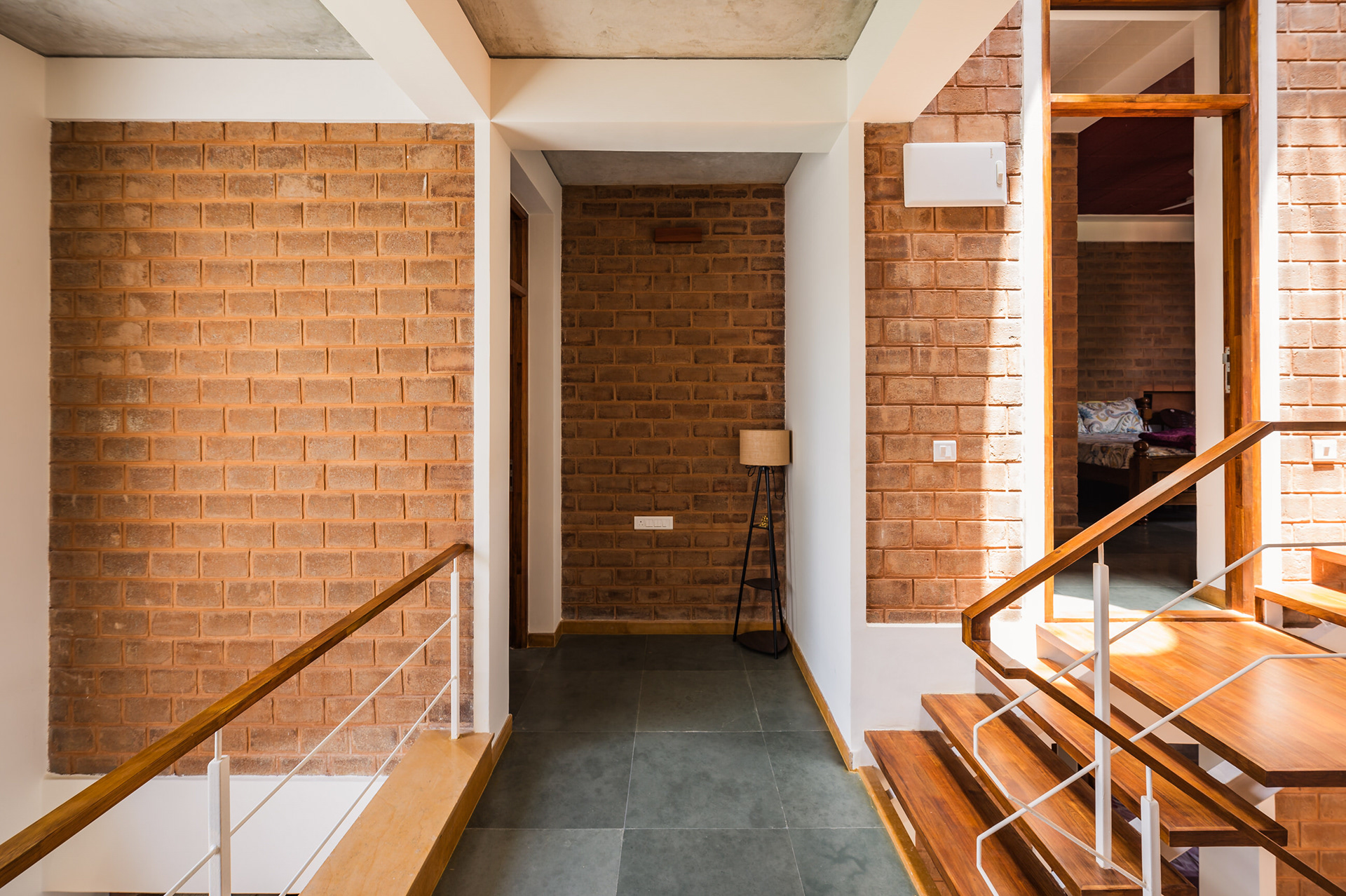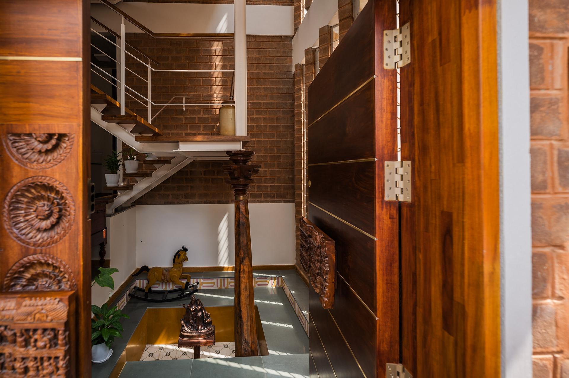 Divyadarshana — A Home Rooted in Material Warmth and Light (Designed and Executed by Studio Alaya | Photography & Project narrative by Ravi Teja Devarakonda) Nestled in the quiet lanes of Bengaluru’s Telecom Layout, Divyadarshana Residence was designed as a warm, functional, and light-filled home for Divya, a homemaker, and Darshan, a software engineer, along with their young daughter. The family envisioned a space that feels open and connected, yet private and calm — a home that resonates with simplicity and honesty. The design approach stemmed from this intent — to create a residence that breathes, where natural light, ventilation, and materiality work together to shape a tranquil everyday experience. The exposed brick façade, interspersed with vertical jaalis, establishes a rhythmic play of solids and voids while bringing filtered daylight into the interiors. The restrained use of concrete bands and wooden textures adds depth and balance to the overall composition. Inside, spaces unfold naturally — the living, dining, and kitchen areas flow into one another, extending toward a small sit-out that connects the indoors with the outdoors. At the heart of the home lies a vertical spine — a staircase crowned by a skylight that draws daylight deep into the house, tying all three levels together visually and spatially. Each material and proportion has been chosen for its integrity and timelessness, allowing the home to age gracefully while maintaining a quiet character. Divyadarshana embodies Studio Alaya’s belief that good architecture is not about excess but about balance — between function and feeling, openness and intimacy, light and form. Design Team: Ar. Lavannya Goradia, Aditi Salunke, Richa Kriplani, SB Namitha, Gitanjali, Karishma Execution Team: Deekshith RN, Praveen Cariappa, Shalini Bai, Rishab Kapoor