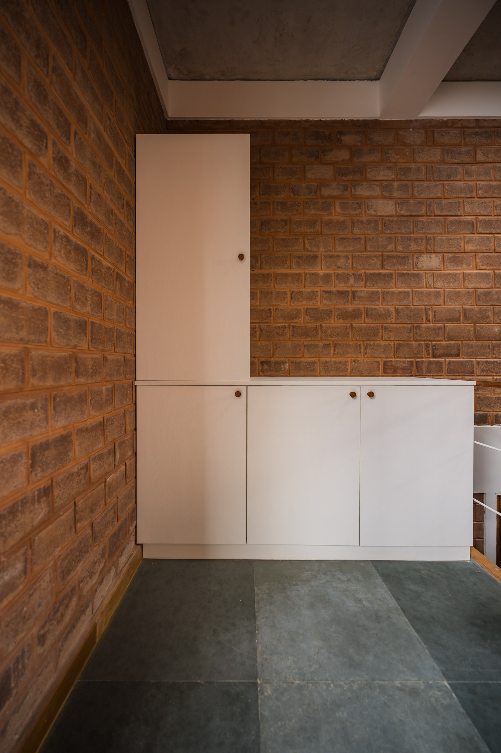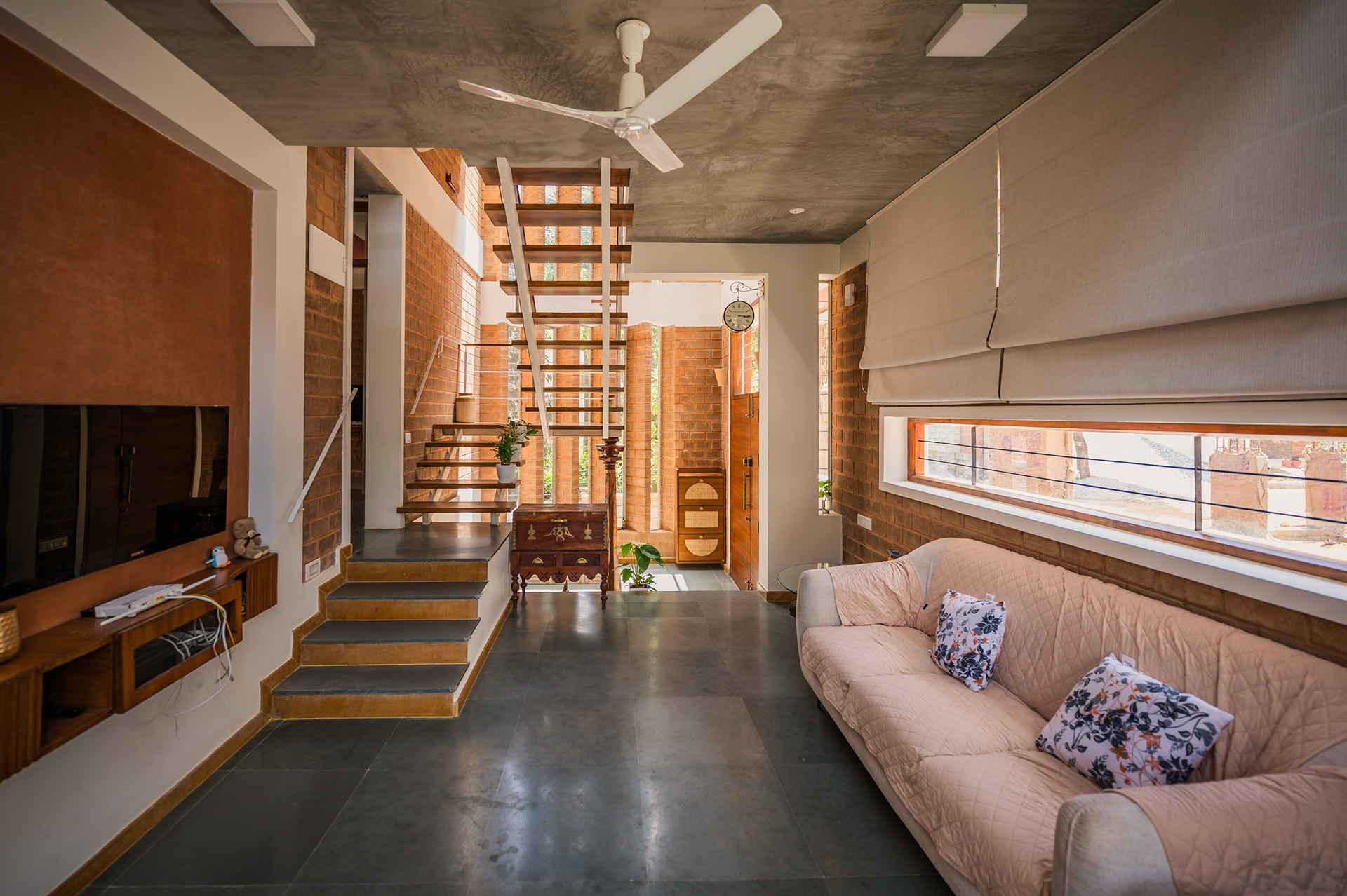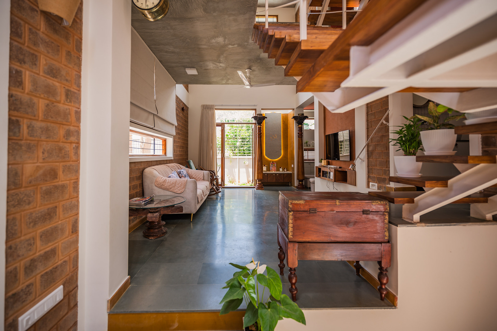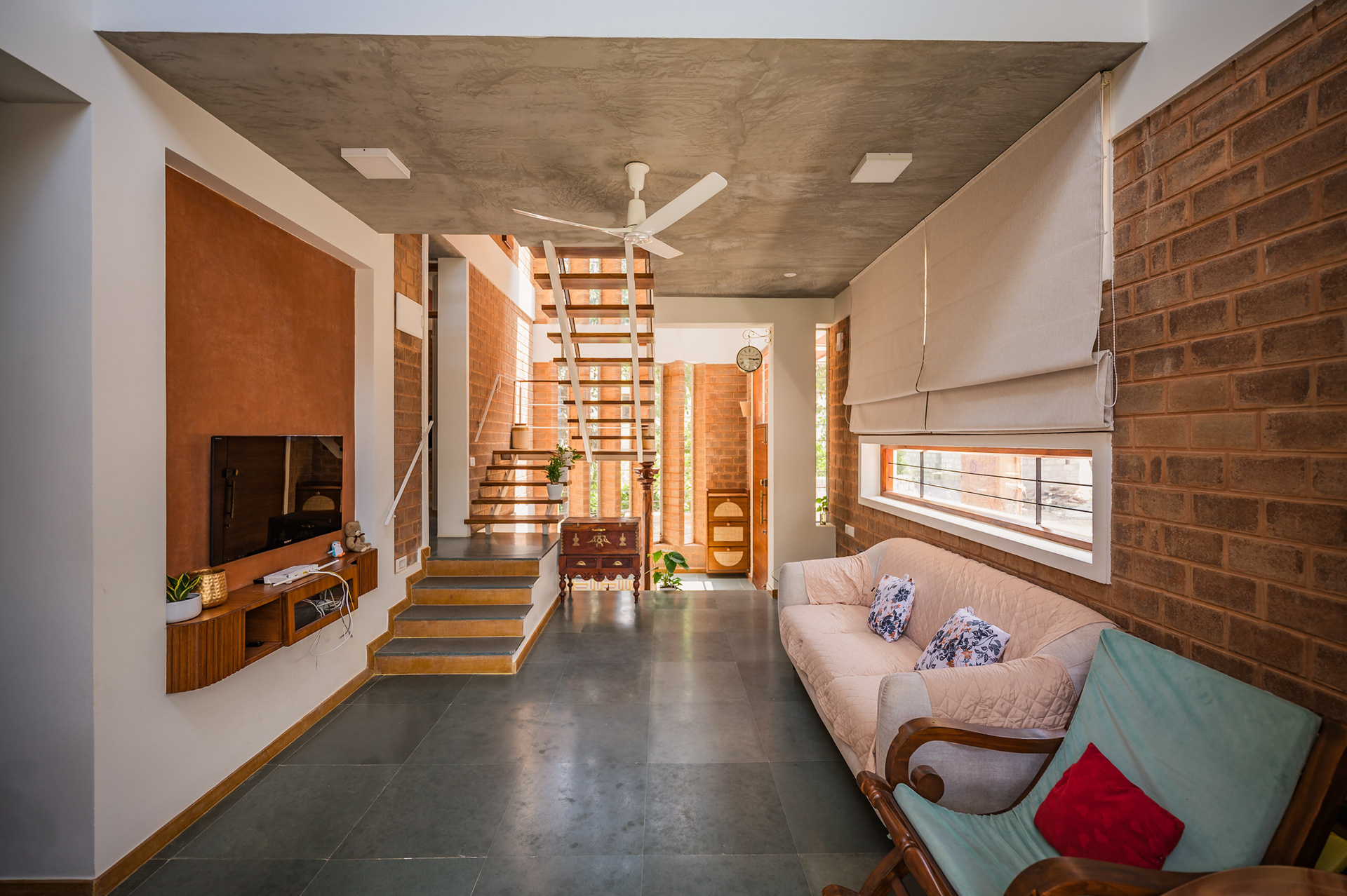 Divyadarshana — A Home Rooted in Material Warmth and Light (Designed and Executed by Studio Alaya | Photography & Project narrative by Ravi Teja Devarakonda) Nestled in the quiet lanes of Bengaluru’s Telecom Layout, Divyadarshana Residence was designed as a warm, functional, and light-filled home for Divya, a homemaker, and Darshan, a software engineer, along with their young daughter. The family envisioned a space that feels open and connected, yet private and calm — a home that resonates with simplicity and honesty. The design approach stemmed from this intent — to create a residence that breathes, where natural light, ventilation, and materiality work together to shape a tranquil everyday experience. The exposed brick façade, interspersed with vertical jaalis, establishes a rhythmic play of solids and voids while bringing filtered daylight into the interiors. The restrained use of concrete bands and wooden textures adds depth and balance to the overall composition. Inside, spaces unfold naturally — the living, dining, and kitchen areas flow into one another, extending toward a small sit-out that connects the indoors with the outdoors. At the heart of the home lies a vertical spine — a staircase crowned by a skylight that draws daylight deep into the house, tying all three levels together visually and spatially. Each material and proportion has been chosen for its integrity and timelessness, allowing the home to age gracefully while maintaining a quiet character. Divyadarshana embodies Studio Alaya’s belief that good architecture is not about excess but about balance — between function and feeling, openness and intimacy, light and form. Design Team: Ar. Lavannya Goradia, Aditi Salunke, Richa Kriplani, SB Namitha, Gitanjali, Karishma Execution Team: Deekshith RN, Praveen Cariappa, Shalini Bai, Rishab Kapoor