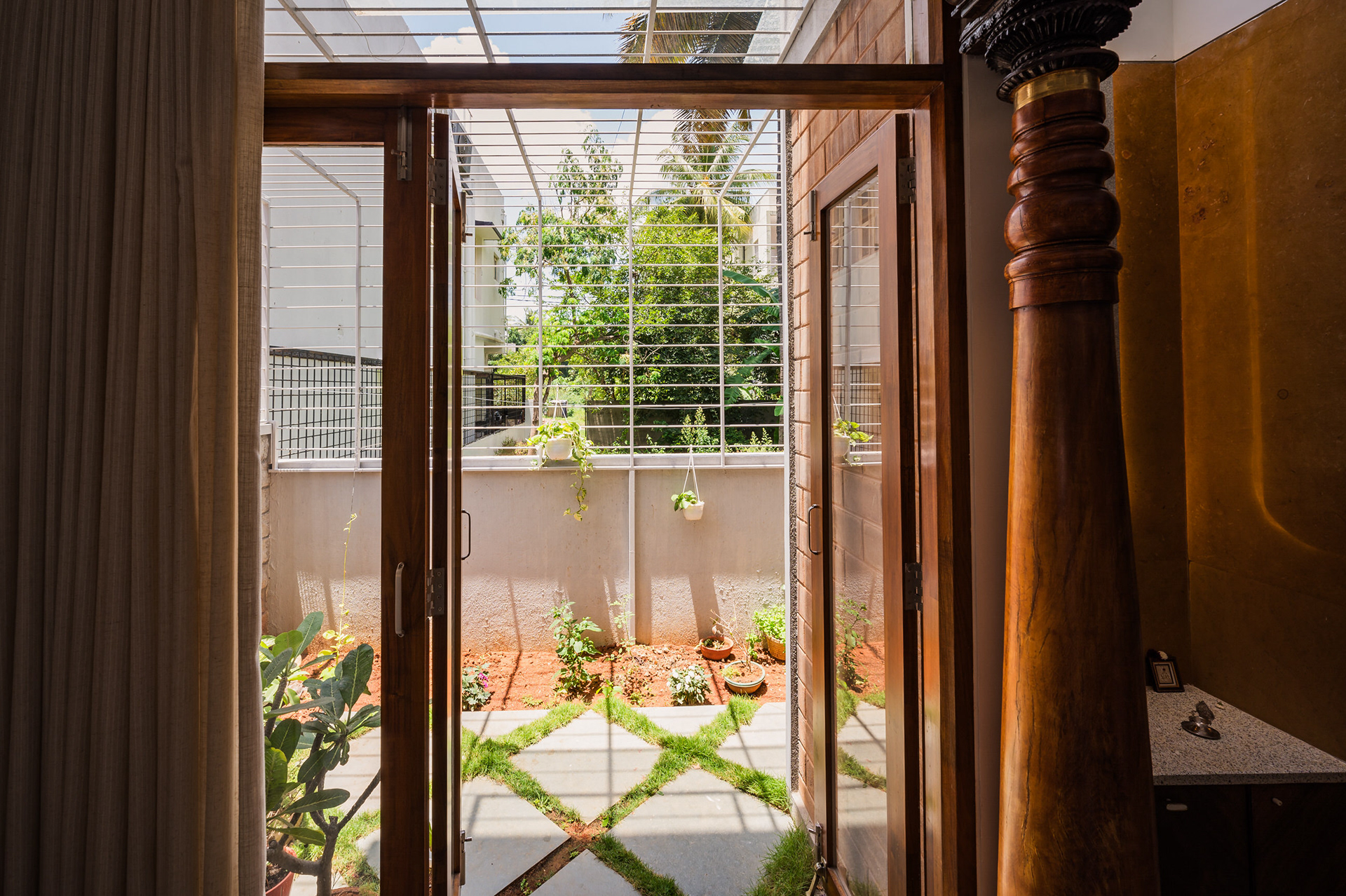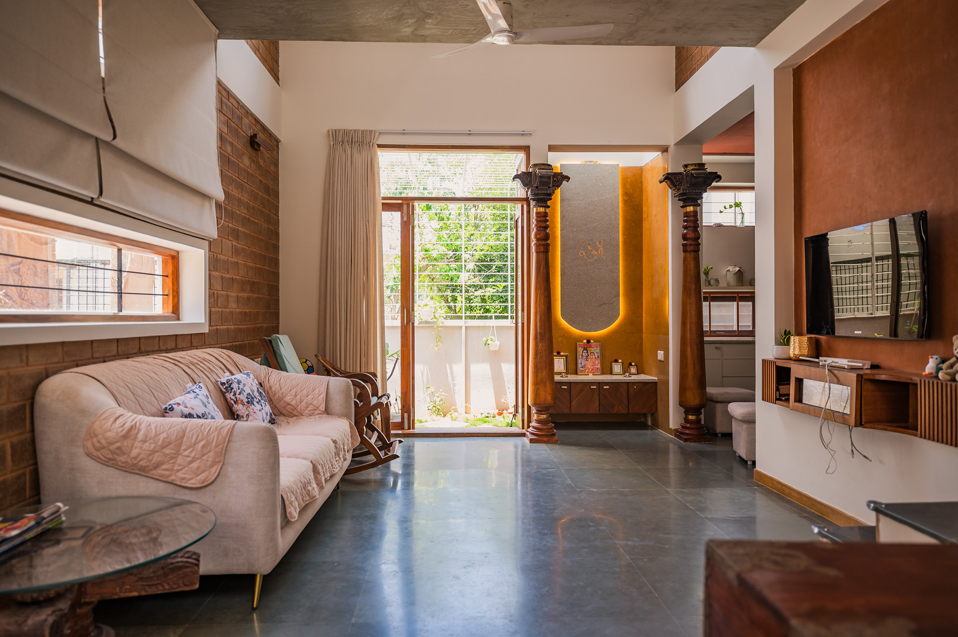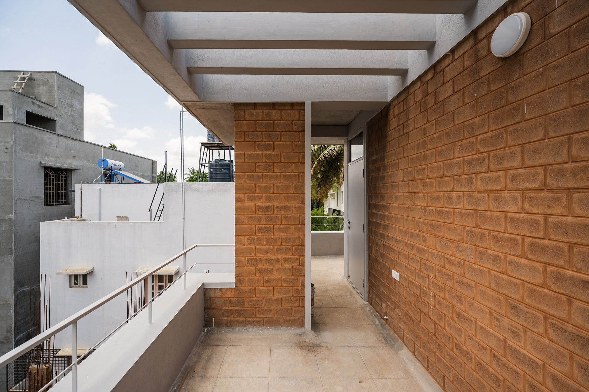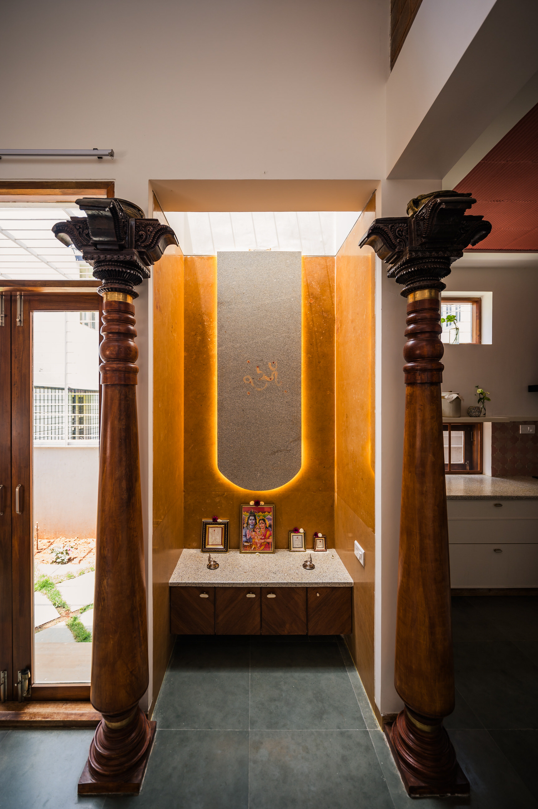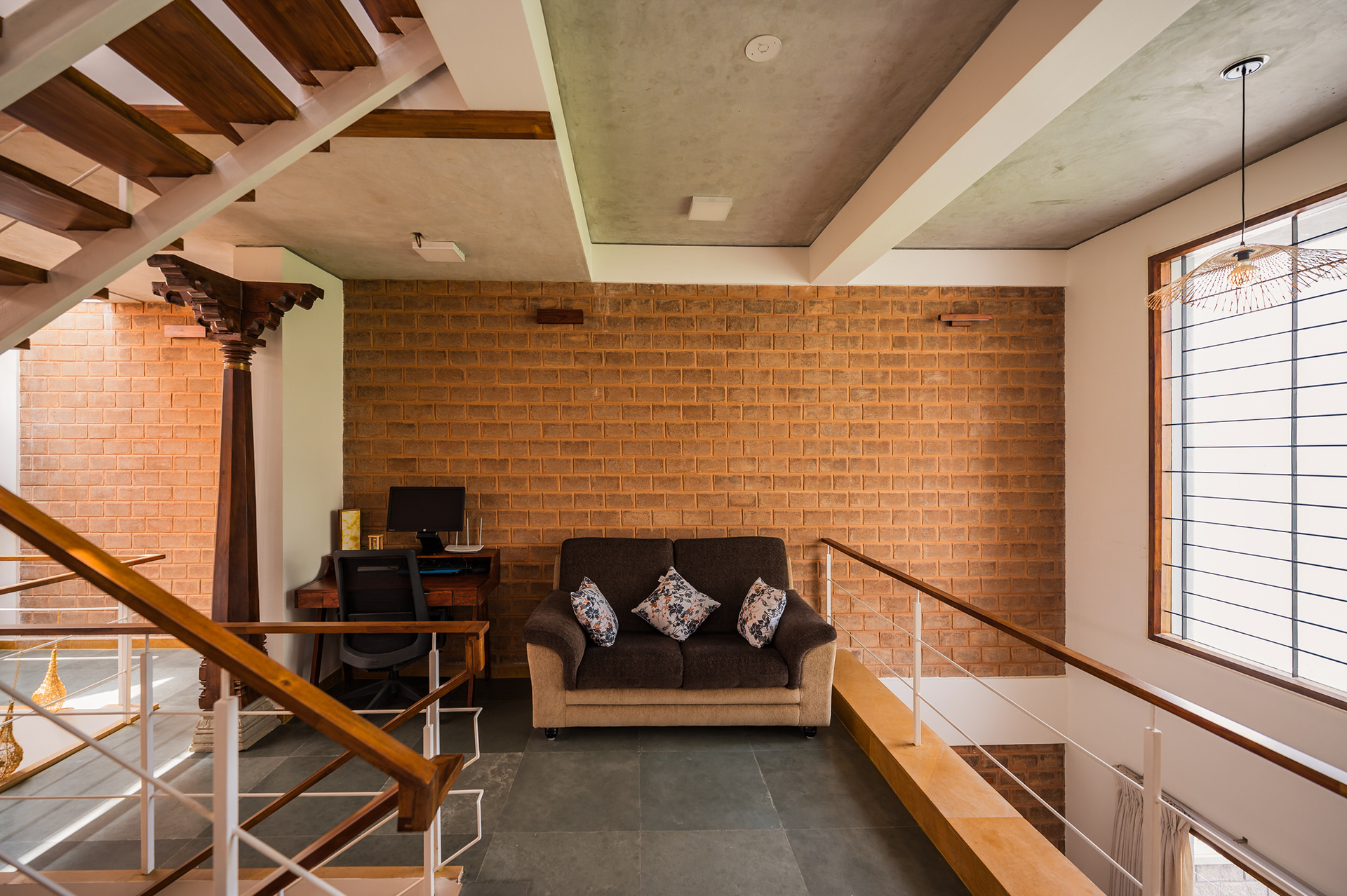 Divyadarshana — A Home Rooted in Material Warmth and Light (Designed and Executed by Studio Alaya | Photography & Project narrative by Ravi Teja Devarakonda) Nestled in the quiet lanes of Bengaluru’s Telecom Layout, Divyadarshana Residence was designed as a warm, functional, and light-filled home for Divya, a homemaker, and Darshan, a software engineer, along with their young daughter. The family envisioned a space that feels open and connected, yet private and calm — a home that resonates with simplicity and honesty. The design approach stemmed from this intent — to create a residence that breathes, where natural light, ventilation, and materiality work together to shape a tranquil everyday experience. The exposed brick façade, interspersed with vertical jaalis, establishes a rhythmic play of solids and voids while bringing filtered daylight into the interiors. The restrained use of concrete bands and wooden textures adds depth and balance to the overall composition. Inside, spaces unfold naturally — the living, dining, and kitchen areas flow into one another, extending toward a small sit-out that connects the indoors with the outdoors. At the heart of the home lies a vertical spine — a staircase crowned by a skylight that draws daylight deep into the house, tying all three levels together visually and spatially. Each material and proportion has been chosen for its integrity and timelessness, allowing the home to age gracefully while maintaining a quiet character. Divyadarshana embodies Studio Alaya’s belief that good architecture is not about excess but about balance — between function and feeling, openness and intimacy, light and form. Design Team: Ar. Lavannya Goradia, Aditi Salunke, Richa Kriplani, SB Namitha, Gitanjali, Karishma Execution Team: Deekshith RN, Praveen Cariappa, Shalini Bai, Rishab Kapoor